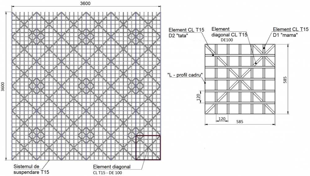 Tavanele de designer Grillato CL-T15 sunt create pe baza tavanelor Grillato CL-T15 cu adaosul elementului diagonal, ce permite crearea direritor desene pe tavan.