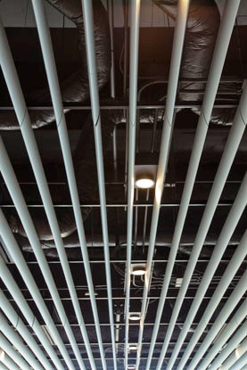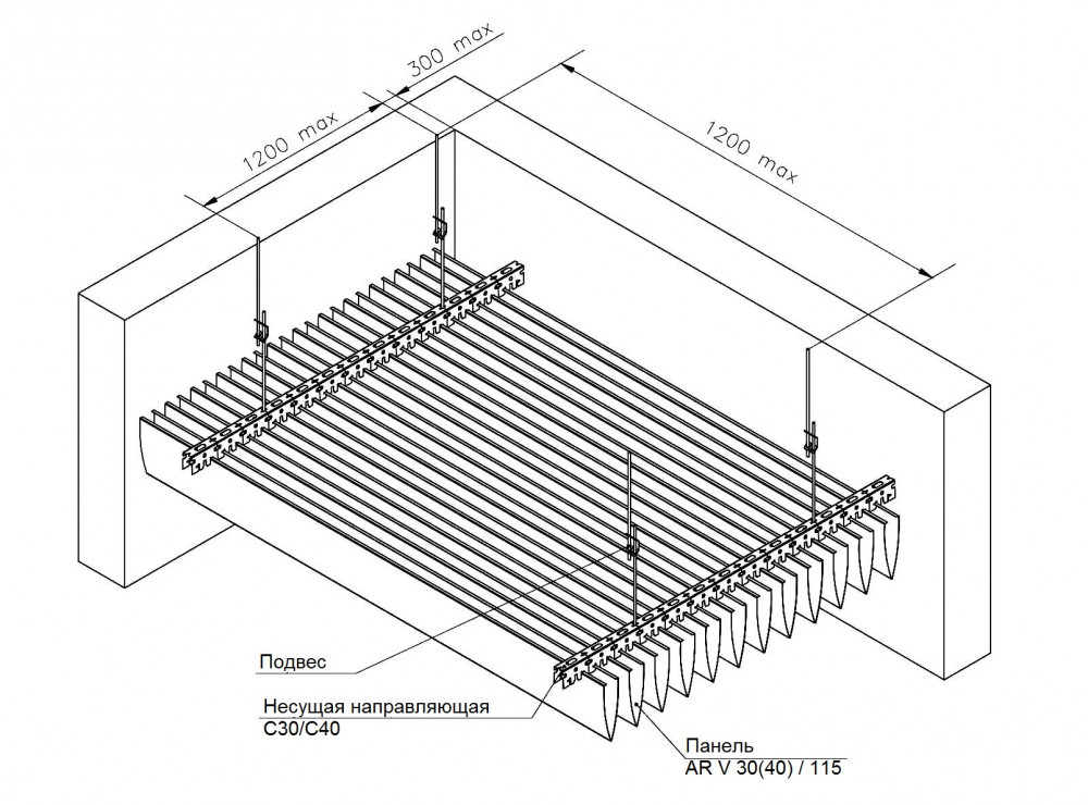 При большом шаге между рейками может быть применена декоративная вставка на гребёнку. Система допускает использование светильников, устанавливаемых между рейками, отлично справляющихся с задачами обеспечения освещения.